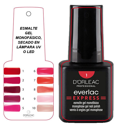 D'Orleac presenta una nueva línea, Everlac Express, un sistema de esmaltado en gel monofásico semipermanente, de fácil aplicación y secado en lámpara LED o UV. Perfecto para realizar una manicura exprés de acabado excelente, sin necesidad de Base ni Top Coat, aunque se aconseja aplicar una base incolora para colores rojos. Su duración aproximada es de 10 días.