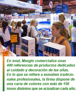 En total, Masglo comercializa unas 400 referencias de productos dedicados al cuidado y decoración de las uñas. En lo que se refiere a esmaltes tradicionales profesionales, la firma dispone de una carta de colores con más de 150 tonos distintos que se actualizan cada año. "Aunque algunas tonalidades se mantienen varias temporadas, se lanza una media de 40 nuevas a lo largo del año", especifica el responsable de Masglo en Europa. Por ejemplo, durante el ejercicio anterior se incluyó una colección nueva de cuatro colores mensuales. Se trata de adaptarse a los gustos y tendencias que puedan surgir en el mercado. "En 20 años de historia, nunca hemos repetido ni colores ni nombres de esmaltes, algo realmente curioso", apunta.