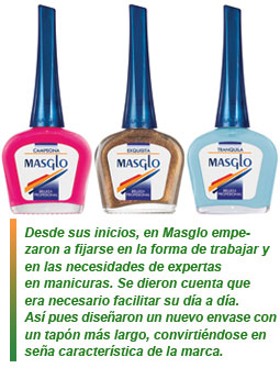 Con su apertura, Masglo cubría un nicho de mercado: los esmaltes desarrollados para expertas en manicuras. Desde la compañía empezaron a fijarse en la forma de trabajar y en las necesidades de este colectivo profesional. Era necesario facilitar el día a día de cada una de ellas. Por lo tanto, se diseñó un nuevo envase con un tapón más largo, convirtiéndose en seña característica de la marca. "El esmalte se podía coger con facilidad y las pinceladas eran más precisas. Casi como si se agarrara un lápiz o un pincel para pintar sobre un lienzo. Además, el envase es más plano y fácil de sujetar, incluso mientras se pintan las uñas", explica Javier Rincón. Igualmente, se incluyeron dos muescas pequeñas en la parte superior del envase para evitar resbalones y derrames del producto.