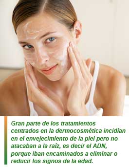 Uno de los principales problemas con los que se encontraba este sector hasta ahora es que una gran parte de los tratamientos centrados en la dermocosmética incidía en el envejecimiento de la piel pero no atacaban a la raíz, es decir el ADN, porque iban encaminados a eliminar o reducir los signos de la edad. La novedad es que los tratamientos que se están desarrollando ahora sí se basan en una acción genética que puede dar respuesta al problema del envejecimiento atacando desde el núcleo de la célula.