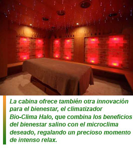 La cabina ofrece también otra innovación para el bienestar, el climatizador Bio-Clima Halo, que combina los beneficios del bienestar salino con el microclima deseado, regalando un precioso momento de intenso relax. Por ello, la permanencia en esta "Gruta" es toda una experiencia emocional, de paz, a la vez que saludable.