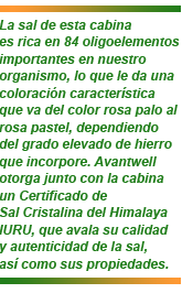 La sal de esta cabina proviene de Paquistán, siendo extraída a mano, tras un periodo de permanencia de 250 millones de años. Por ello es rica en 84 oligoelementos importantes en nuestro organismo, lo que le da una coloración característica que va del color rosa palo al rosa pastel, dependiendo del grado elevado de hierro que incorpore. Avantwell otorga junto con la cabina un Certificado de Sal Cristalina del Himalaya IURU, que avala su calidad y autenticidad de la sal, así como sus propiedades.