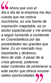 Ahora que vivo el día a día de la empresa me doy cuenta que me motiva muchísimo, es una fuente de inspiración inagotable, es un sector espectacular y me anima a seguir luchando e invirtiendo en Cosmobelleza por las posibilidades tan grandes que tiene. Es un mercado muy importante y dinámico, lleno de vida. A pesar de la crisis general, podemos estar contentos de pertenecer a este sector que ofrece innumerables oportunidades.