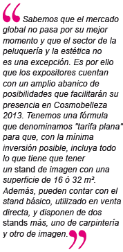 B.M.: Han creado una serie de packs para facilitar que puedan asistir los expositores. Detállenoslo, por favor. C.R.: Sí, sabemos que el mercado global no pasa por su mejor momento y que el sector de la peluquería y la estética no es una excepción. Es por ello que los expositores cuentan con un amplio abanico de posibilidades que facilitarán su presencia en Cosmobelleza 2013. Tenemos una fórmula que denominamos "tarifa plana" para que, con la mínima inversión posible, incluya todo lo que tiene que tener un stand de imagen con una superficie de 16 ó 32 m². Además, pueden contar con el stand básico, utilizado en venta directa, y disponen de dos tipos de stands más, uno de carpintería y otro de imagen.