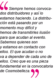C.R.: Siempre hemos convocados distribuidores y así lo estamos haciendo. La distribución está pasando por un momento muy difícil y hemos de transmitirles ilusión para que acudan al evento. Sabemos quienes son y estamos en contacto con ellos. El que acudan o no va a depender de cada uno de ellos. Creo que es una pieza fundamental en la convocatoria de Cosmobelleza.