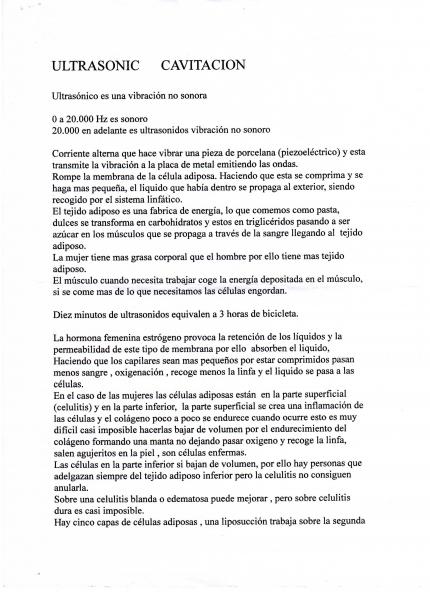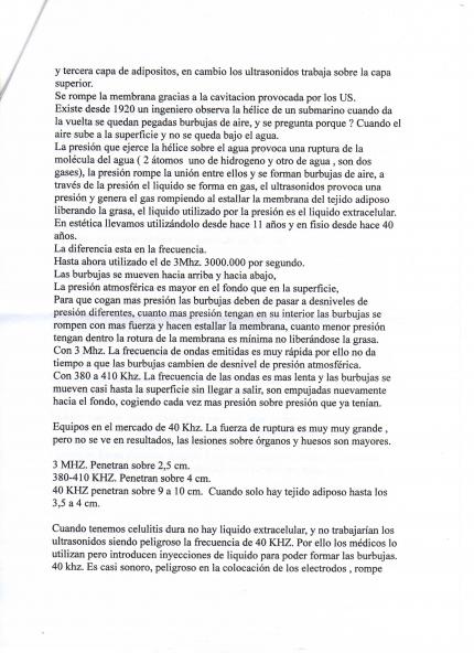 yo me lío con tanta palabrería y unas veces una cosa y otras veces otra, vamos a ver si me puedo aclarar yo por lo menos, por lo que estás diciendo entonces a menos de 100khz se denominaría potencia médica y necesita infiltración (eso es lo que me he vuelto loca durante un montón de tiempo y se me había dicho poco menos que estaba majara), si dices que la potencia que yo uso carece de efecto implosivo, térmico y sonoforético...¿me puedes explicar qué porras hace mi máquina entonces? porque yo tengo resultados en las clientas, yo mido y la mayoría en 1 sesión bajan de 2 a 2,5 en la zona, por lo que yo tengo entendido, unos son cavitadores inestables (los de menos de 100) y los otros son estables, y cavitadores de alta frecuencia 1-3mhz...que yo sepa no se le denominan cavitadores a estos.- De todos modos a ver cuando puedo hablar con la empresa y me explica estas cosillas, porque esto es para volverse loca, cuando tengo aclaradas las cosas...ahora tú poco más que me dices que es un engaño, pues vaya...pero bueno engaño sé que no es porque los resultados los tengo, así que a ver quién está equivocado.