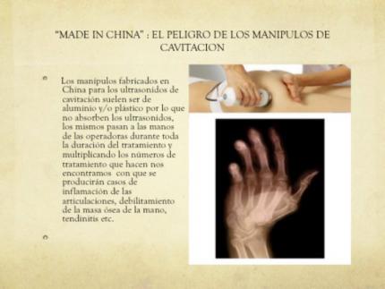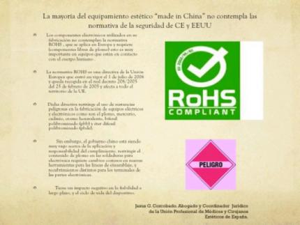 ^China es una gran nación y excelente productora, pero también es conocida por sus falsas tecnologías, copias, y, por consiguiente, aparatología mediocre e inestable. El sector de la ^estética profesional^ está invadido por esta tecnología barata y en si misma peligrosa para quien la utiliza y quien la recibe. Pidamos siempre referencias de fabricación y compromiso escrito del importador de ser ciertas las especificaciones técnicas de esos aparatos. El prestigio profesional y la salud están en juego^.