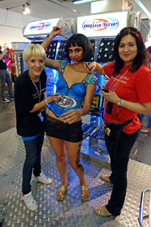 Las modelos de Cazcarra Image Group iban maquilladas de medio cuerpo, imitando camisetas de Aqualine. Mientras desfilaban por todo el recinto fueron muchos los que se acercaron para poder comprobar la técnica tan apurada de este tipo de maquillaje. Los trabajos se realizaron con productos de la línea FX de Cazcarra, especialmente con el Aquacolor, que aporta una mayor intensidad de color y resistencia. La promoción fue todo un éxito, tanto para Cazcarra Image Group como para la marca promocionada.