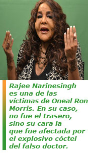 Sin embargo, tras la divulgación de la noticia por los medios de comunicación americanos, varias mujeres llamaron a la policía para denunciar las prácticas de este falso médico. El único problema es que las denuncias eran anónimas y la policía no podía hacer nada. Finalmente, Rajee Narineshing, otro transexual de 48 años también de Miami, denunció a Morris. En su caso, no fue el trasero, sino su cara la que fue afectada por el explosivo cóctel del falso doctor. Rajee se ha quedado con las mejillas abultadas, el mentón deforme y un voluminoso labio superior maltrecho después de su sesión especial de belleza.