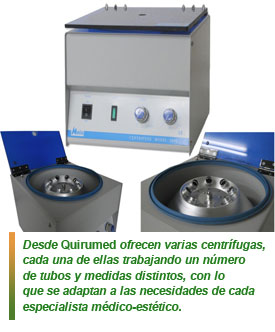 Desde Quirumed ofrecen varias centrífugas, cada una de ellas trabajando un número de tubos y medidas distintos, con lo que se adaptan a las necesidades de cada especialista médico-estético.