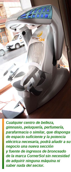 CornerSol te presenta una idea de negocio, un nuevo modelo empresarial surgido de la creatividad que pretende instalarse como el futuro del bronceado artificial. Esta empresa instala franquicias corner de bronceado dentro de negocios ya en funcionamiento uniendo fuerzas y sinergias. La configuración ideal consta de tres máquinas de bronceado, dos horizontales y una vertical. "La superficie total que ocupa son exactamente 15 metros cuadrados, destinados a tres cabinas de bronceado. Es muy conveniente que una de las máquinas esté en el escaparate del establecimiento para atraer a más publico, ya que el bronceado es una compra por impulso", afirma Alberto González, director de expansión de la enseña.