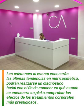 Además, las asistentes conocerán las últimas tendencias en nutricosmética, podrán realizarse un diagnóstico facial con el fin de conocer en qué estado se encuentra su piel o comprobar los efectos de los tratamientos corporales más prestigiosos, como Adipoablate®, Dermoescultura 3D® o Cyclone.