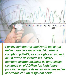 Los investigadores analizaron los datos del estudio de asociación del genoma completo (GWAS, en sus siglas en inglés) de ese grupo de islandeses. GWAS compara cientos de miles de diferencias comunes en el ADN de los individuos para ver si alguna de estas variantes están asociadas con un rasgo conocido.