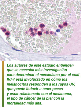 Los datos revelaron que una variante en una región no codificante, un potenciador que regula el gen IRF4, está asociada con el rasgo combinado de sensibilidad solar, cabello castaño, ojos azules y pecas. La investigación sitúa a IRF4 entre los más de 30 genes vinculados con la pigmentación, incluyendo una variante genética encontrada previamente en las personas con pecas y pelo rojo.