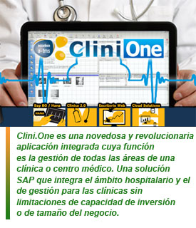 Clini.One aporta al sector clínico las más innovadoras soluciones tecnológicas. La nueva solución integrada con SAP Business One, pone a disposición de todas las clínicas el acceso a los mejores recursos tecnológicos para su gestión, sea cuál sea su especialización, tamaño y capacidad. Clini.One es una solución personalizable, que se implanta y crece a tu medida, reduce la curva de aprendizaje y facilita un rápido retorno de la inversión.