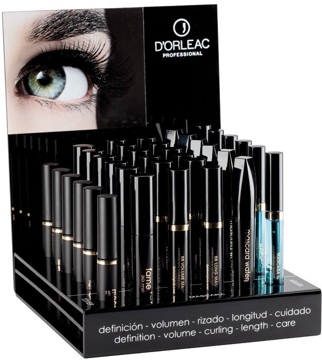Ideal para la venta en el salón, este expositor de máscaras de ojos permite almacenar cinco unidades de las siguientes referencias: Delineadora, BB Long, BB Volume, Fame Look y máscara transparente. Incluye un tester de cada modelo.
