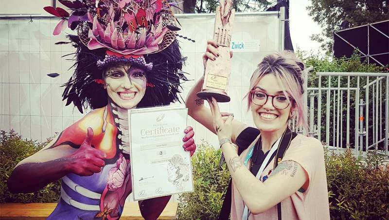Las bilbaínas Yolanda y Lorena Ramón han ganado el tercer premio de la categoría amateur en pintura corporal en el World Bodypainting Festival, celebrado en Wörthersee (Austria) del 1 al 3 de julio. Con un trabajo en tonos morados, rojos y anaranjados, que Lorena realizó sobre el cuerpo de su hermana Yolanda, buscaban plasmar los conceptos de fantasía y libertad, rematado por un tocado de mariposas.