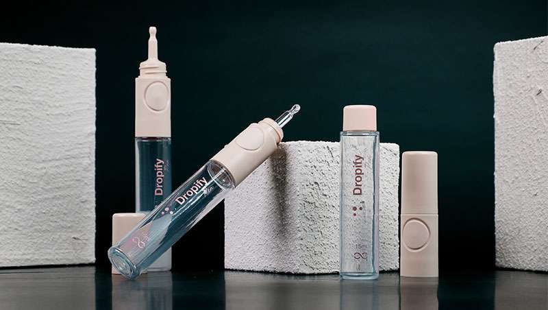 Dropify Pen es un envase elegante y alargado con dos botones blandos que facilitan la aplicación. Solo hay que pulsarlos al mismo tiempo para extraer la fórmula, gota a gota. El diseño moderno le confiere un aspecto novedoso y refrescante, y brinda una experiencia sugestiva al usuario: es una versión 2.0 del clásico botón pulsador. Haciéndose eco del auge de los cosmocéuticos, ofrece el aspecto de un producto farmacéutico con el toque añadido de sofisticación que le otorga sus motivos decorativos de alta gama. Asimismo, se encuentra en desarrollo una pipeta transparente de PET con vistas a adaptarla aún más a las marcas del cuidado de la piel de orientación médica.