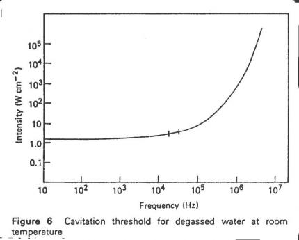 Así, a diferentes frecuencias, la cantidad de energía mínima (potencia) requerida para producir las burbujas debe superar un valor umbral (límite de cavitación). Para superar ese umbral, trabajando en un medio acuoso, la densidad de potencia necesaria sería de 0,3 w/cm^2 a 20 khz o 0,5 w/cm^2 para 40 khz.