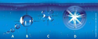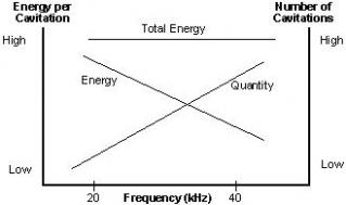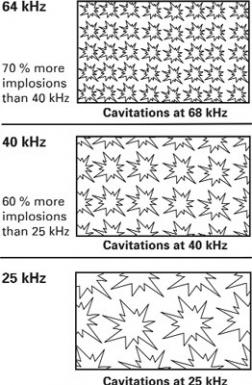 A frecuencias entre 60-100 khz, se forman muchas más burbujas pero de tamaño mucho menor y por tanto de menor energía implosiva. A frecuencias superiores, el número de burbujas aumenta todavía más pero su efecto implosivo apenas pone en juego energía.