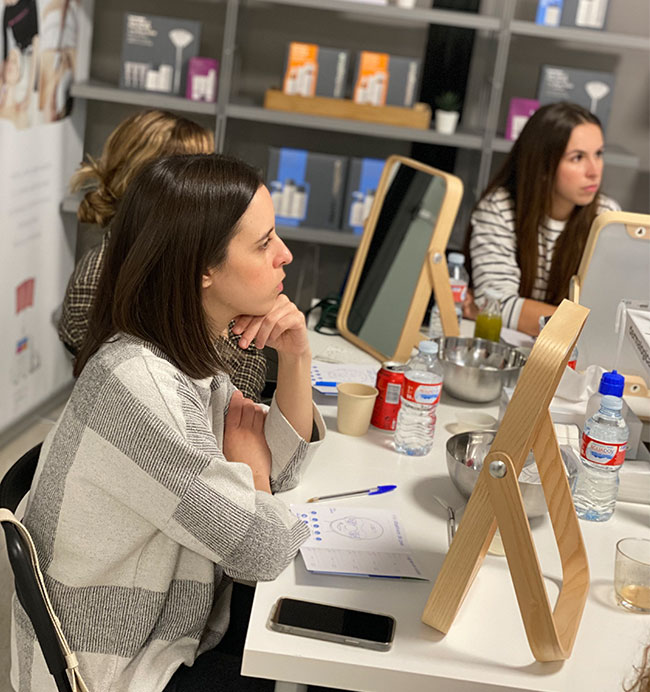 Se trata de workshops más cortos, sencillos, divertidos y dinámicos para facilitar su comprensión. Los alumnos juegan y experimentan con los productos, sus texturas, aromas y colores. Incluso, "les animamos a que traigan sus propios productos (de la marca que sean) para informarles sobre ellos: si son los más idóneos para su piel, si tienen algún ingrediente perjudicial, si lo usan de forma correcta... Nuestras misión es educar y guiar y que ello se convierta en toda una experiencia para todos. Lo hacemos con grupos muy reducidos para poder atender a todos cómo se merecen y también por teléfono, video llamada, whatsapp y redes. No queremos que nadie tenga dudas sobre cómo cuidar su piel".
