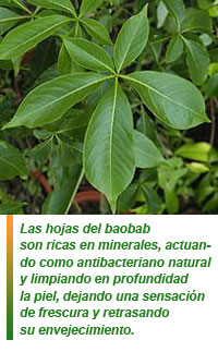 Naturalmente emolientes, ricas en minerales, permiten a la piel alimentarse y regenerarse rápidamente; además actúan como antibacteriano natural, limpian en profundidad dejando una sensación de frescura, retrasando el envejecimiento de la piel. En los antiguos pueblos africanos, los niños y los adultos eran sumergidos en una infusión de hoja de baobab para aliviar las picaduras de insectos, llagas y otras inflamaciones cutáneas.