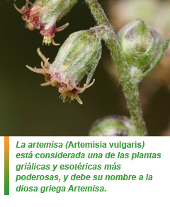 La artemisa (Artemisia vulgaris) está considerada una de las plantas griálicas y esotéricas más poderosas, y debe su nombre a la diosa griega Artemisa. Se le atribuyen muchas propiedades mágicas y actualmente se usa para diferentes usos terapéuticos como pueden ser para provocar el apetito, regular el sistema nervioso o para dolores y regulación de los ciclos menstruales.