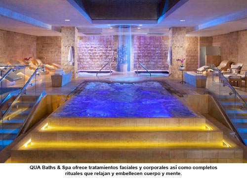 QUA Baths & Spa, un espacio de relax ubicado en la segunda planta de la Torre Augustus Tower en Caesars Palace, es un tranquilo oasis de 50.000 metros cuadrados inspirado en la ancestral tradición romana que ofrece un total de 51 cabinas de tratamiento entre las que se incluyen siete cabinas faciales, tres espacios dobles, tres cabinas húmedas con duchas Vichy, una sauna con vigas de madera, baños de vapor, bañeras de hidromasaje y 5.500 metros cuadrados de área fitness.