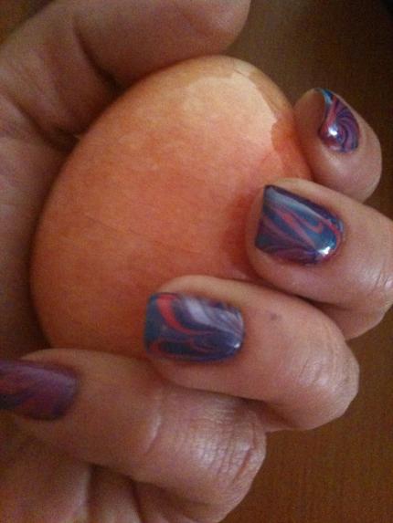 la forma de hacerlo es super facil esmaltas la uña dejas que se seque si es esmalte normal y si es permanente lo curas , entonces en un bol con agua vas poniendo una o dos gotas de los colores que quieras mezclar procurando que caigan unos dentro de otros para que puedas hacer el dibujo con todos a la vez , una vez estan los colores con un palito o un alfiler vas arrastrando el color de dentro a fuera o al reves como mas te guste y vas formando un dibujo (esto hay que hacerlo rapidito) cuando veas una mezcla que te guste metes la uña en el agua poniendo encima del la parte del dibujo que quieras imprimir , recoges con el palito el color restante para que no se te pegue a la uña y te lo estropee todo y voila!! sacas la uña con el esmalte adherido a la uña a continuacion brillo si es esmalte o top si es permanente (primero que se seque el agua)mirad en youtube se ve bien el paso a paso.ahh yo no se si hay alguna casa que comercialice esmaltes de estos yo estoy usando los mas baratos del chino