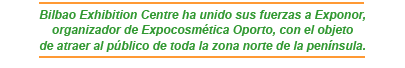 La reciente firma de un acuerdo de colaboración entre Bilbao Exhibition Centre y Exponor Feria de Oporto, ve su primer fruto en la organización de Expocosmetica Bilbao, Beauty, Wellness & Fashion, la primera feria de la belleza integral y cuidado personal de Euskadi que tendrá lugar en Bilbao del 15 al 17 de marzo de 2014.