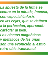 La apuesta de la firma se centra en la mirada, intensa, con especial énfasis en las cejas, que se definen a la perfección, aportando carácter al look. Los párpados enfatizan la mirada con el blanco y negro, formando ahumados para añadir misterio a los ojos. Contrastan los labios con rojos irreverentes, tentadores, que invitan al deseo.