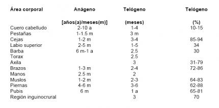 En la cabeza o en la nuca, tan sólo el 10% de los folículos se encuentran en fase telógena con una duración media de entre 1 y 4 meses.