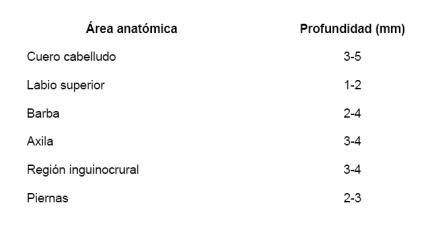 Dado que la profundidad de penetración la marca fundamentalmente la frecuencia, para los folículos situados a una profundidad superior a 2 mm necesitaremos potenciar las altas longitudes de onda (filtros de corte máximos). Por otro lado, el grosor de estos cabellos también es mayor, lo cual invita a aumentar el tiempo de pulso acercándonos al TRT. Finalmente, al perder selectividad hacia el cromóforo (melanina) en el rango de longitudes de onda altas, podremos y deberemos aumentar la fluencia.