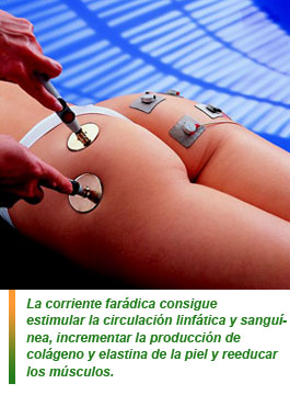 La corriente farádica (alterna) se aplica a nivel muscular colocando parches conductores en los músculos a tratar. La corriente estimula de forma involuntaria las contracciones musculares como si el paciente estuviera haciendo deporte (es por ello que se le conoce como gimnasia pasiva). La corriente farádica consigue así estimular la circulación linfática y sanguínea, incrementar la producción de colágeno y elastina de la piel y reeducar los músculos. Esto se traduce en unos glúteos más firmes y tonificados, una mejora en la textura y calidad de la piel y una disminución de la grasa y la celulitis.