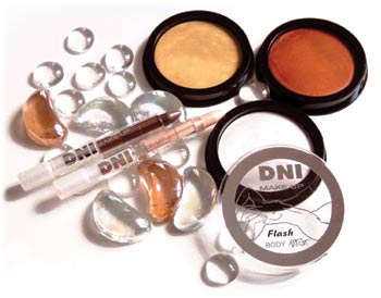DNI Make up presenta como novedad para el verano productos iluminadores y bronceadores con efectos flash perfectos para deslizarse por rostros y cuerpos descubiertos que serán invadidos con los destellos dorados, platas y cobres. Productos que iluminarán y adornarán las pieles morenas por el sol, dándoles toques de frescor y vitalidad durante el día, y brillos de seducción y elegancia en las noches estivales.