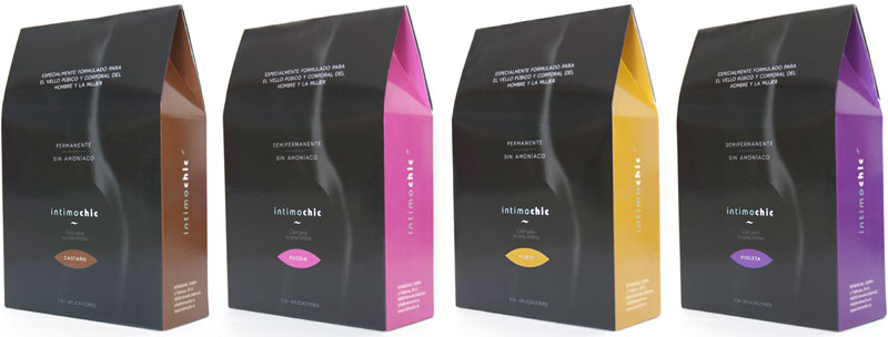 Íntimochic está disponible en 4 colores: castaño, rubio, violeta y fucsia. El castaño y el rubio son tintes permanentes y se usan para poder cubrir totalmente las canas del pubis y otras zonas, mejorando el atractivo de dichas áreas. Se puede aplicar con la frecuencia deseada.
