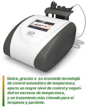 - Sistema STC (Sistema de Control de Temperatura). Programando la temperatura deseada de protocolo atérmico, térmico o hipertérmico, Iónica ofrece un avanzado control automático de temperatura que aporta un mayor nivel de control y seguridad en excesos de temperatura, y un tratamiento más cómodo para el terapeuta y paciente.