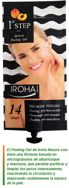 Peeling Gel, de Iroha Nature, se presenta con una imagen más atractiva y didáctica que facilita su uso en cabina y reventa en centros de estética y belleza. Este peeling contiene una fórmula basada en microgránulos de albaricoque y manzana. Posee textura scrub de uso mecánico que purifica y limpia intensamente los poros. Al aplicarlo, este limpiador reactiva la circulación y mejora la textura de la piel.