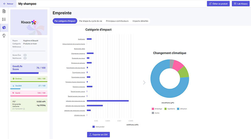 El Lab Kisaco permite ver los datos actuales del producto y sugerir cambios para reducir la huella de carbono, generando versiones antes y después para mostrar las mejoras.