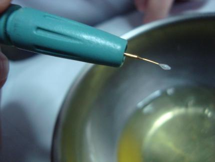 El experimento consiste en utilizar la clara de un huevo para observar el tamaño y forma de la microlesión tal como se produciría en los tejidos humanos. Como se ve en la imagen anterior, la corriente de alta frecuencia ha formado un coágulo con forma de "pera", forma similar a la del folículo piloso.
