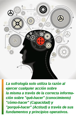 » La sofrología, por lo dicho, solo utiliza la razón al ejercer cualquier acción sobre la misma a través de la correcta información sobre "qué-hacer" (conocimiento) "cómo-hacer" (Capacidad) y "porqué-hacer" (Actitud) a través de sus fundamentos y principios operativos.