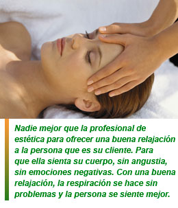 Nadie mejor que la profesional de estética para ofrecer una buena relajación a la persona que es su cliente. Para que ella sienta su cuerpo, sin angustia, sin emociones negativas. Con una buena relajación, la respiración se hace sin problemas y la persona se siente mejor. Permitir a otros disfrutar de estos momentos tan agradables, sutilmente permite instalar ya una gran meta, que es aliviar los temores y relativizar las molestias que puedan estar asociadas con una técnica particular, sea lo que sea (desde un masaje a una depilación con cera). Es el comienzo de un manejo del estrés en una forma simple y sutil.