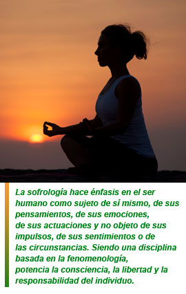 La sofrología hace énfasis en el ser humano como sujeto de sí mismo, de sus pensamientos, de sus emociones, de sus actuaciones y no objeto de sus impulsos, de sus sentimientos o de las circunstancias. Siendo una disciplina basada en la fenomenología, potencia la consciencia, la libertad y la responsabilidad del individuo.