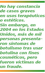 No hay constancia de casos graves en usos terapéuticos o estéticos. Sin embargo, en 2004 en los Estados Unidos, más de mil personas presentaron síntomas de botulismo tras usar botulina con fines cosméticos, pero fueron víctimas de un fraude, ya que los que lo vendieron les habían aplicado un sustituto del bótox, con un tipo no autorizado para uso humano.