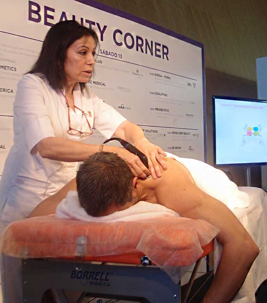Las técnicas de regeneración celular de Sorisa han abierto las muestras de este espacio con la presentación de Sorisa Beauty Solutions, perfecto para todo tipo de piel e indicado para devolver esplendor a la piel grasa, aportando hidratación, combatiendo la flacidez y atenuando las arrugas. Se requieren entre 6 y 12 sesiones, aproximadamente, y se recomienda una sesión mensual. Posteriormente ha tocado el turno de Indiba Deep Beauty tratamiento capilar, siendo necesarias unas 3 sesiones al mes.