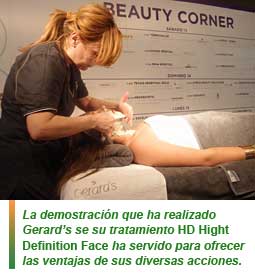 HD Hight Definition Face es un tratamiento de Gerard’s. Su demostración ha servido para ofrecer las ventajas de sus diversas acciones. En una primera acción como regenerador iluminador se aplica el Dermashine Treatment y luego el tensor recompactante con la blue mask + colágeno bio; en la tercera acción toca el redensificante celular con luxury caviar + bio elastina. Extrem Firmess Complex ha centrado la muestra de Pb Serum.