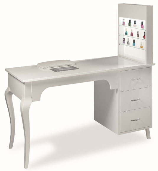 Una de los modelos más demandados. Elegante mesa de manicura en madera lacada en color blanco. Se puede pedir con o sin expositor. Con el expositor lleva baldas de cristal y está iluminada. Incorpora tres cajones de gran capacidad, aspirador y apoyamanos incluido.