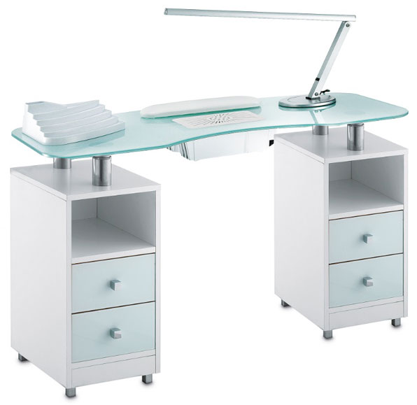 Mesa de manicura de madera en dos colores a elegir entre blanco o wengué. Con doble cajonera de gran capacidad por cada módulo. Encimera de cristal satinado. Aspirador AR5 de 60W, lámpara expositor y apoyamanos incluidos.