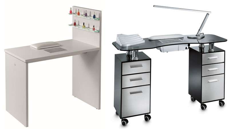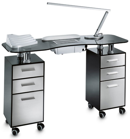 Mesa de manicura de gama alta con estructura de madera. Frontales de cajones en acero cepillado. Encimera de vidrio templado. Aspirador extraíble con filtro AR5 de 60W. Gran tubo de larga duración en color ahumado y moka. Incluye lámpara, apoyamanos y expositor de esmaltes.