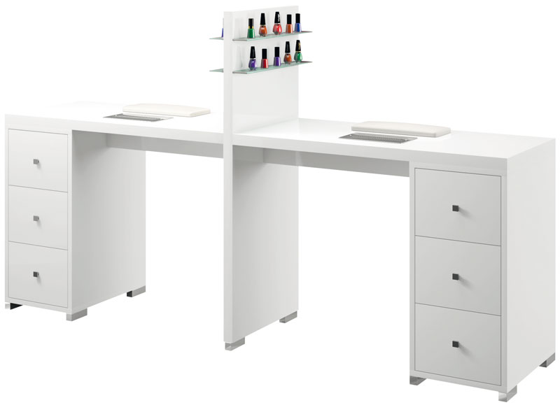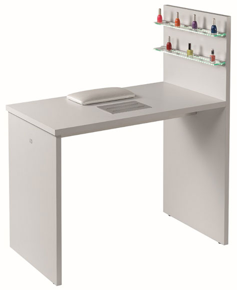 Mesa de manicura de alta calidad con estantes de vidrio estructura laminada en blanco. Lleva incorporado el aspirador. Este modelo se puede pedir solo o en versión doble, compartiendo el expositor central.